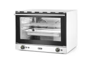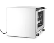 Piec konwekcyjny H100 HENDI to solidne urządzenie wykonane ze stali nierdzewnej, wyposażone w bezpośrednie nawilżanie, podwójne wentylatory oraz grzałki, zapewniające równomierne i niezawodne działanie. Posiada drzwi z podwójnym przeszkleniem z nienagrzewającą się szybą, wewnętrzne oświetlenie oraz miejsce na 4 tace GN 1/1 z odstępem 75 mm między prowadnicami Tylne przyłącze wody oraz 120-minutowy timer wspierają płynną pracę w kuchniach o dużym natężeniu pracy.