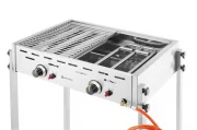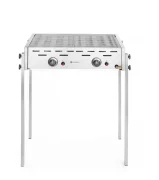 Dostępny w 2 wersjach: wolnostojąca lub nablatowa. 2 niezależne palniki gazowe z zapalnikiem piezoelektrycznym. 2 osłony palników wykonane ze stali nierdzewnej AISI 430. 2 ruszty ze stali chromowanej, o wymiarach 470x320 mm. Duża tacka ociekowa, pomaga również w utrzymaniu ciepła. Miedziane zawory z systemem automatycznego odłączania przepływu gazu – system uruchamia się po zgaszeniu płomienia. W zestawie wąż gazowy z reduktorem. Odpowiedni do użytku na gaz propan i butan