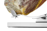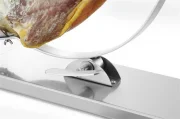 Stojak na szynkę firmy HENDI jest doskonałym narzędziem do krojenia na plastry hiszpańskiej szynki dojrzewającej (jamón serrano lub iberico). Stojak stabilnie utrzymuje szynkę na miejscu podczas krojenia, ułatwiając uzyskanie zawsze jednakowych, bardzo cienkich plastrów. Pozycję szynki można regulować tak, by mieć dostęp do każdej części wędliny. Uchwyt i podstawa wykonane z satynowanej stali nierdzewnej – solidna konstrukcja do bezpiecznego umieszczenia hiszpańskiej szynki dojrzewającej z kością (jamón serrano). Jedna śruba do stabilnego zamocowania szynki, znajdująca się w pierścieniu (o 80 mm). Pierścień umożliwia obracanie szynki, ułatwiające dostęp do każdej części mięsa. Uchwyt jest ruchomy – przechyla się na prawą lub lewą stronę. Maks. odległość między śrubami mocującymi: ok. 480 mm. Wymiary podstawy: 570×215×(H)35 mm. Przeznaczony do samodzielnego montażu (klucz imbusowy w zestawie).